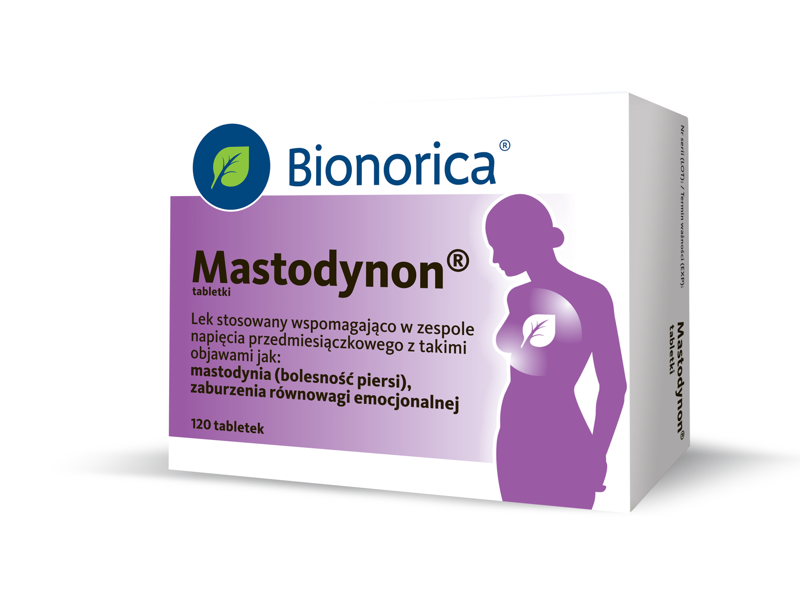 Nazwa produktu leczniczego: Mastodynon, tabletki. Produkt złożony. Postać farmaceutyczna: tabletki. Wskazanie terapeutyczne do stosowania: Wspomagająco w zespole napięcia przedmiesiączkowego z takimi objawami, jak: mastodynia (bolesność piersi), zaburzenia równowagi emocjonalnej, po wykluczeniu przez lekarza poważnych przyczyn dolegliwości. Podmiot odpowiedzialny: Bionorica SE, 92308 Neumarkt, Niemcy. Informacji o leku udziela: Bionorica Polska Sp. z o.o., ul. Hrubieszowska 6B, 01- 209 Warszawa.